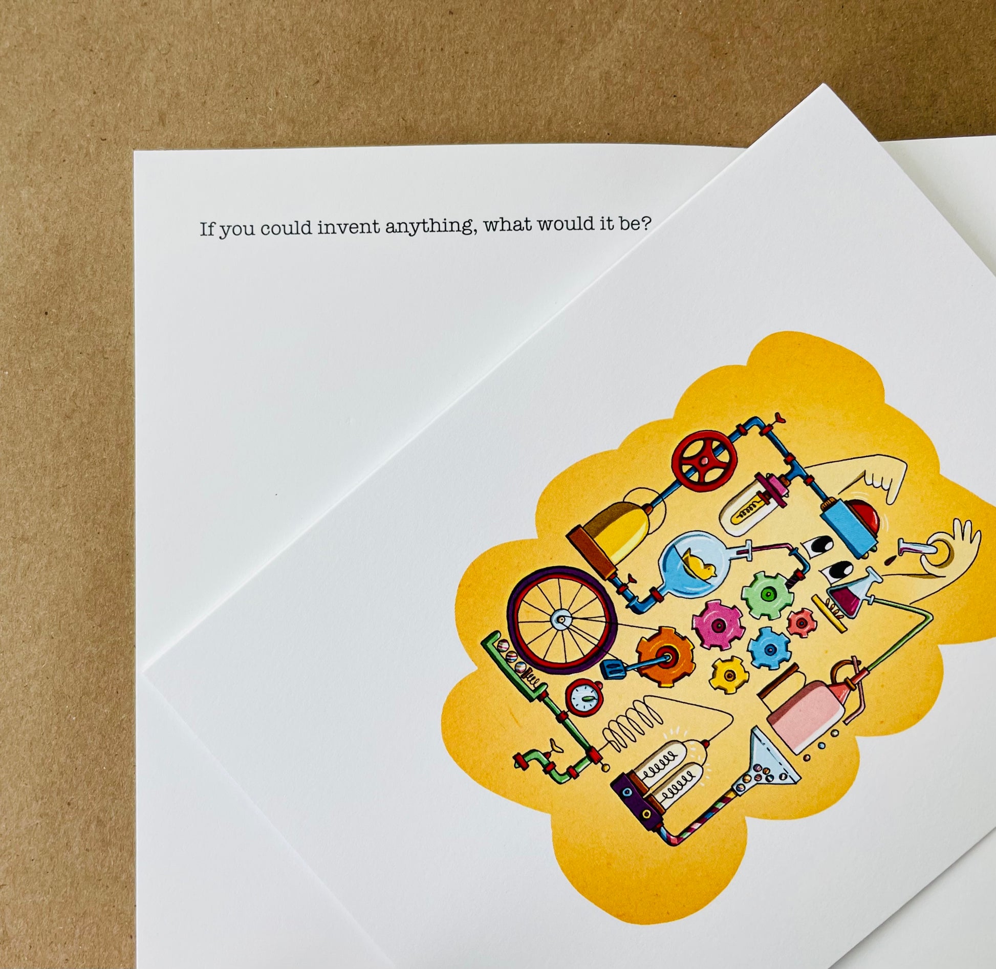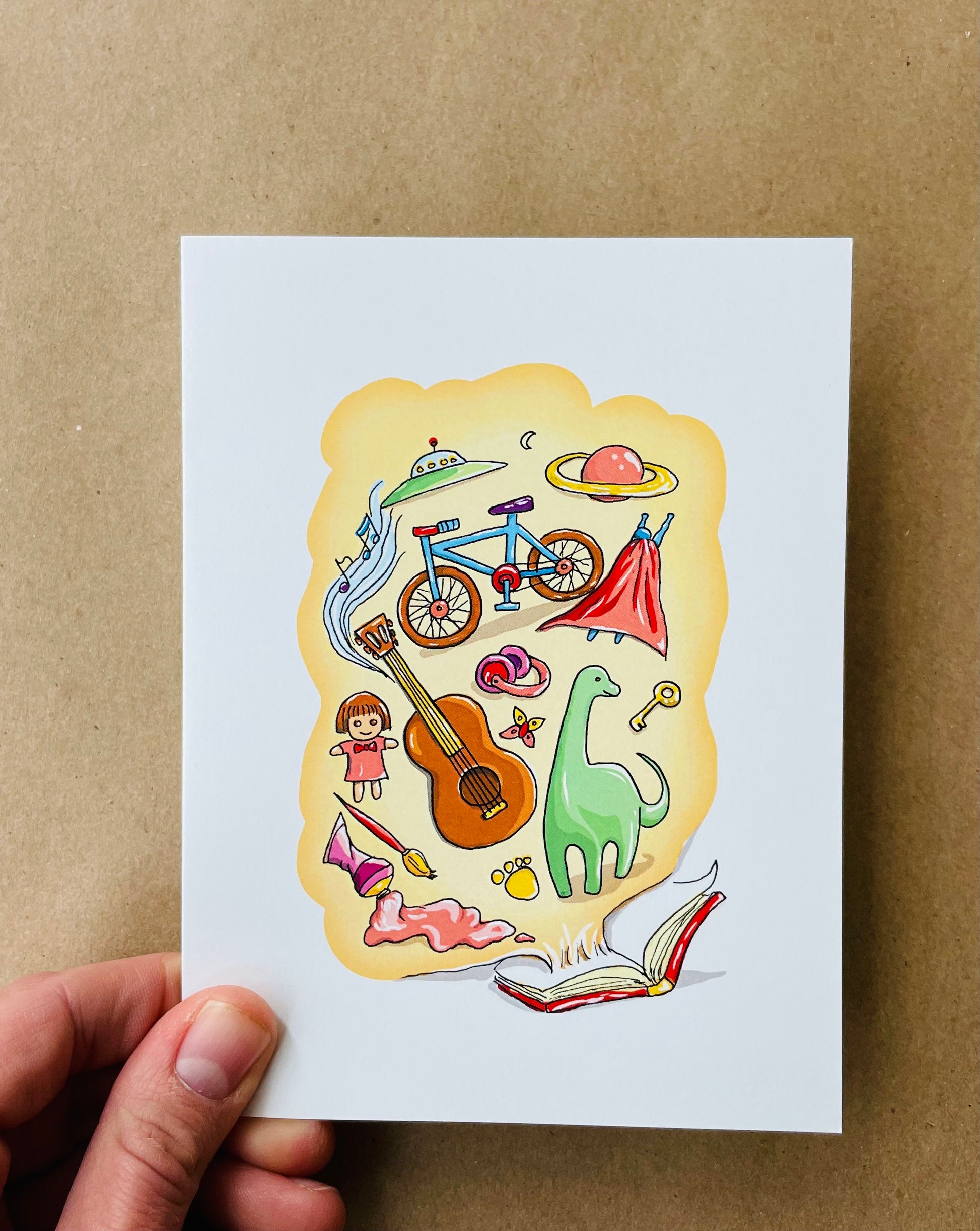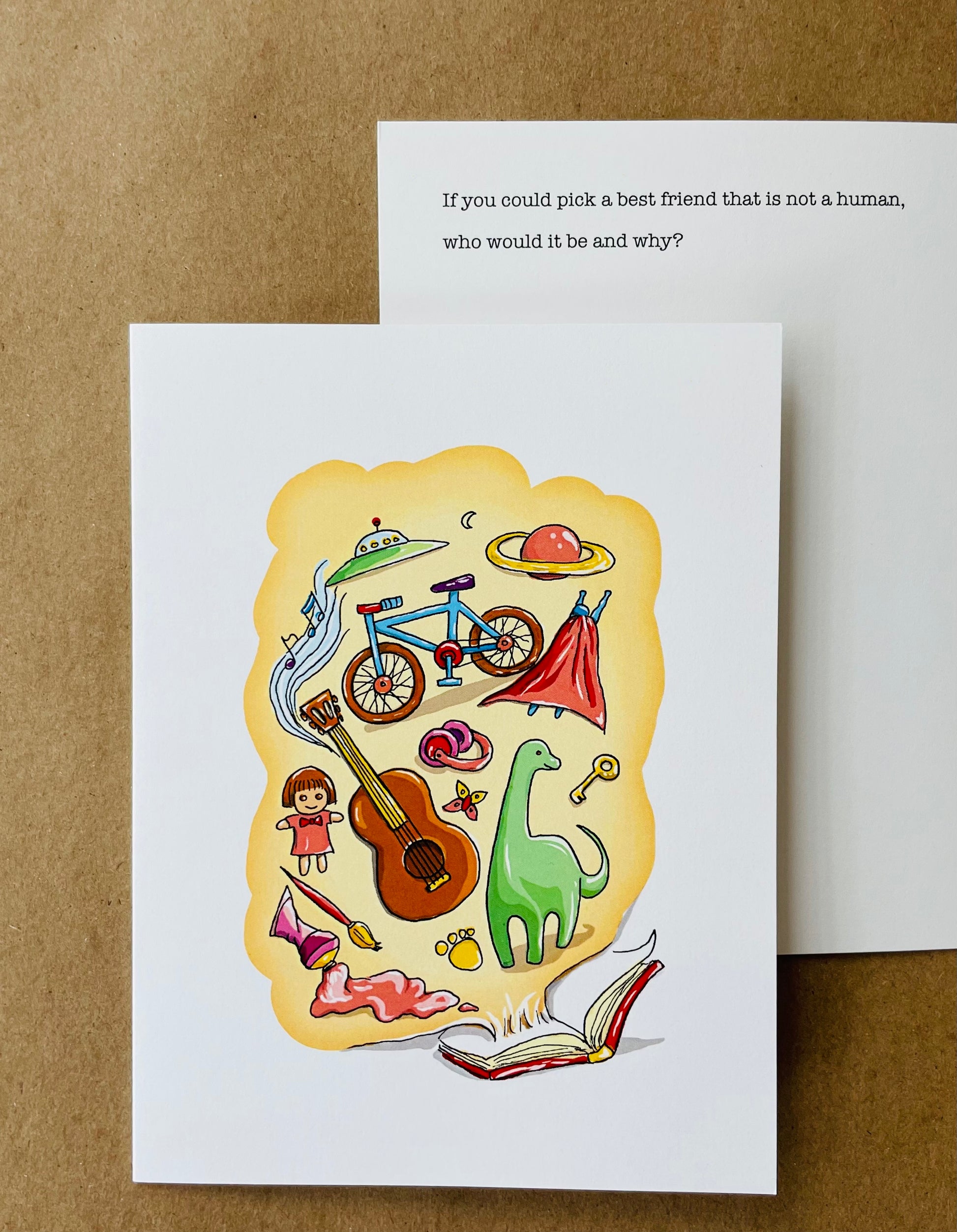 This set of cards paired with prompts is designed to help spark someone's imagination: use them to connect with your kids, to connect your kids with their cousins or their grandparents. The art was designed by a sister illustrator duo and every illustration evokes the prompt.