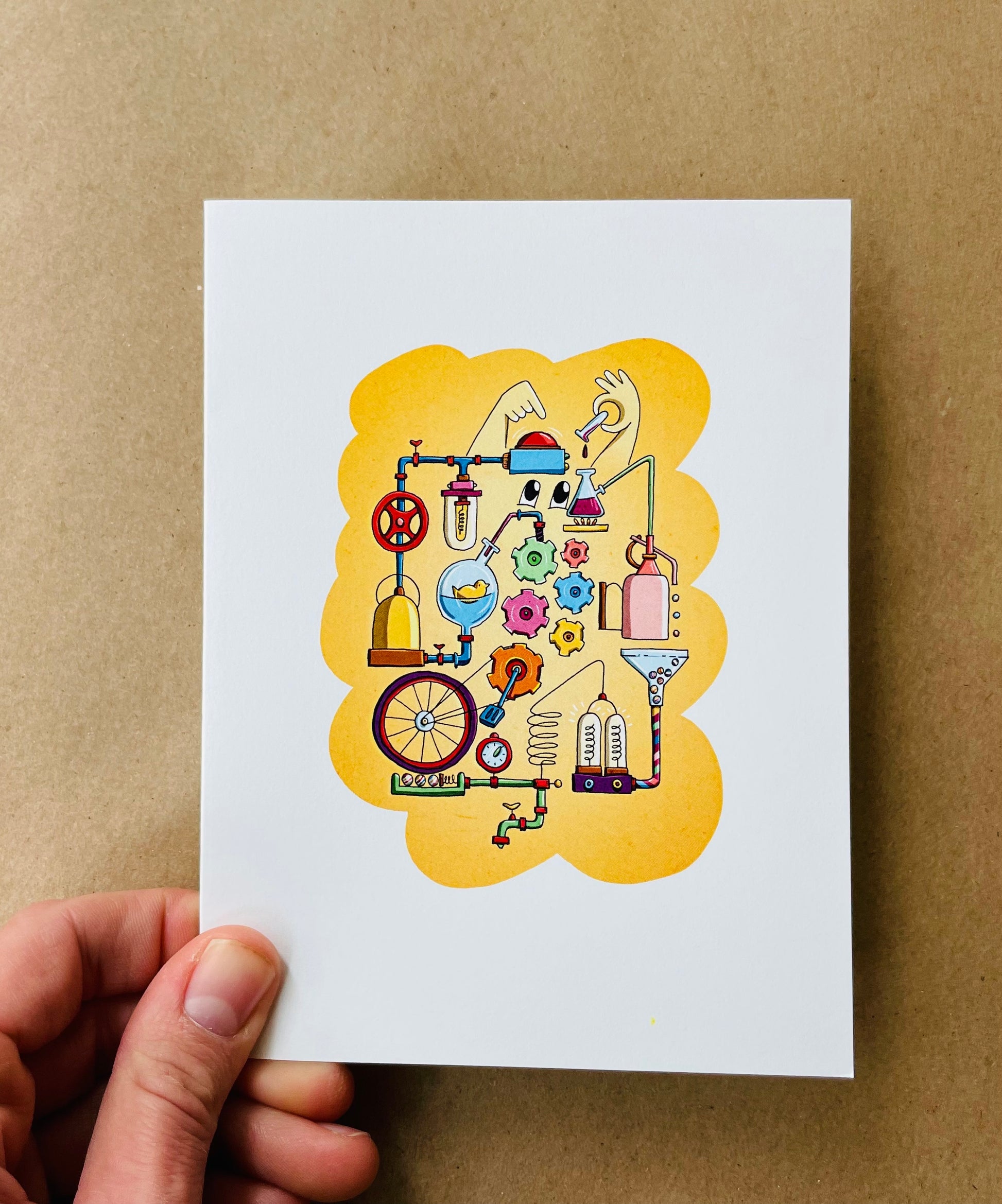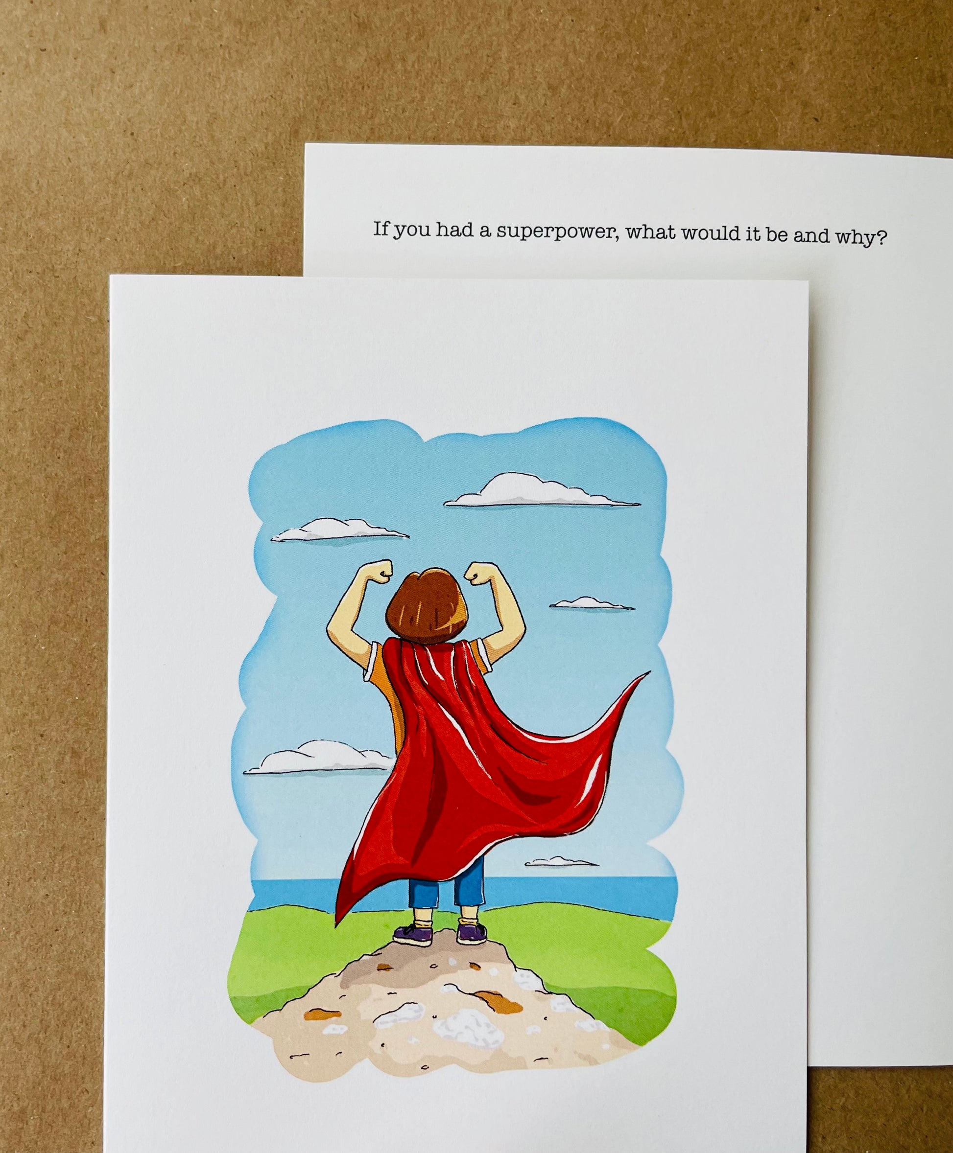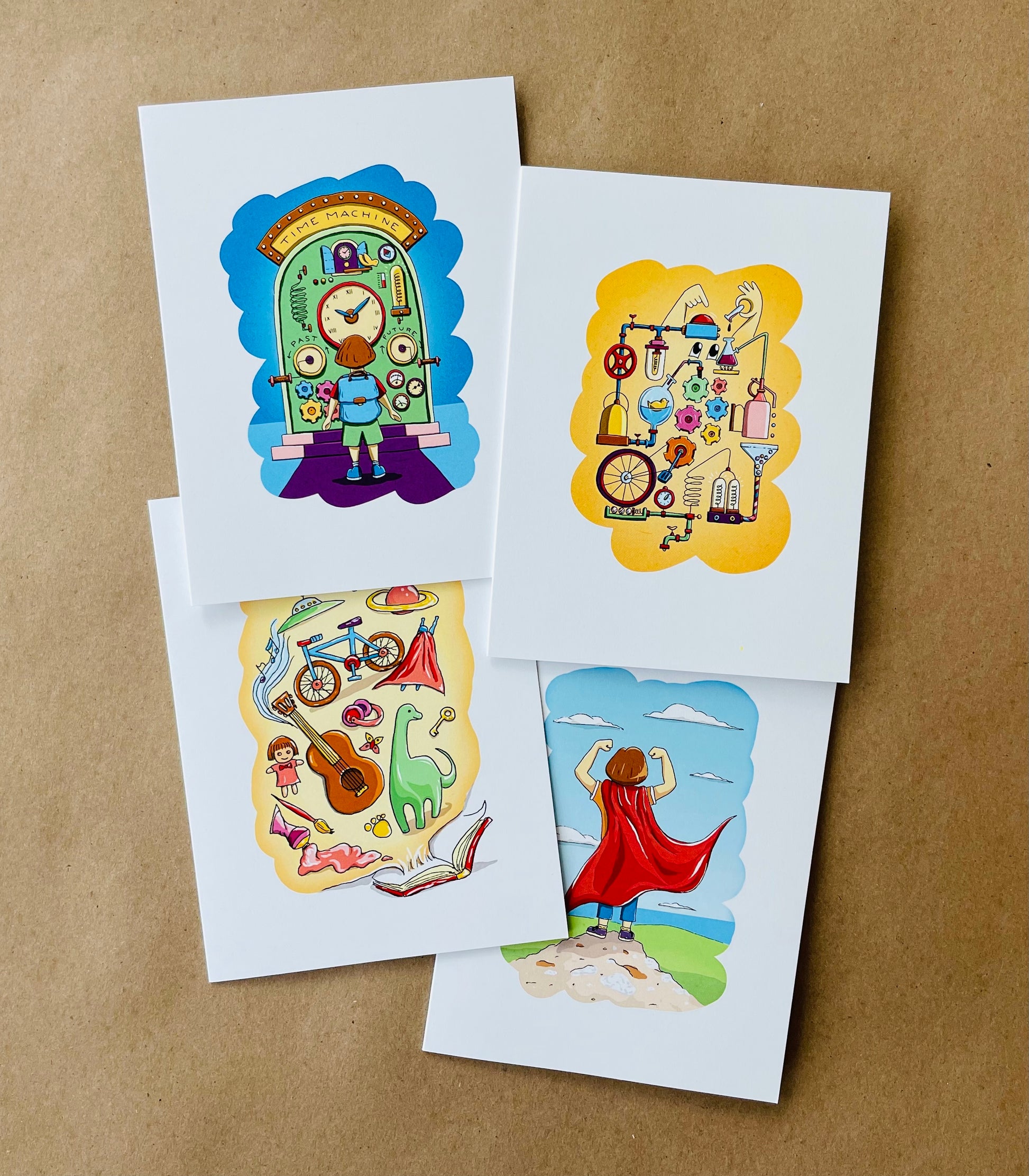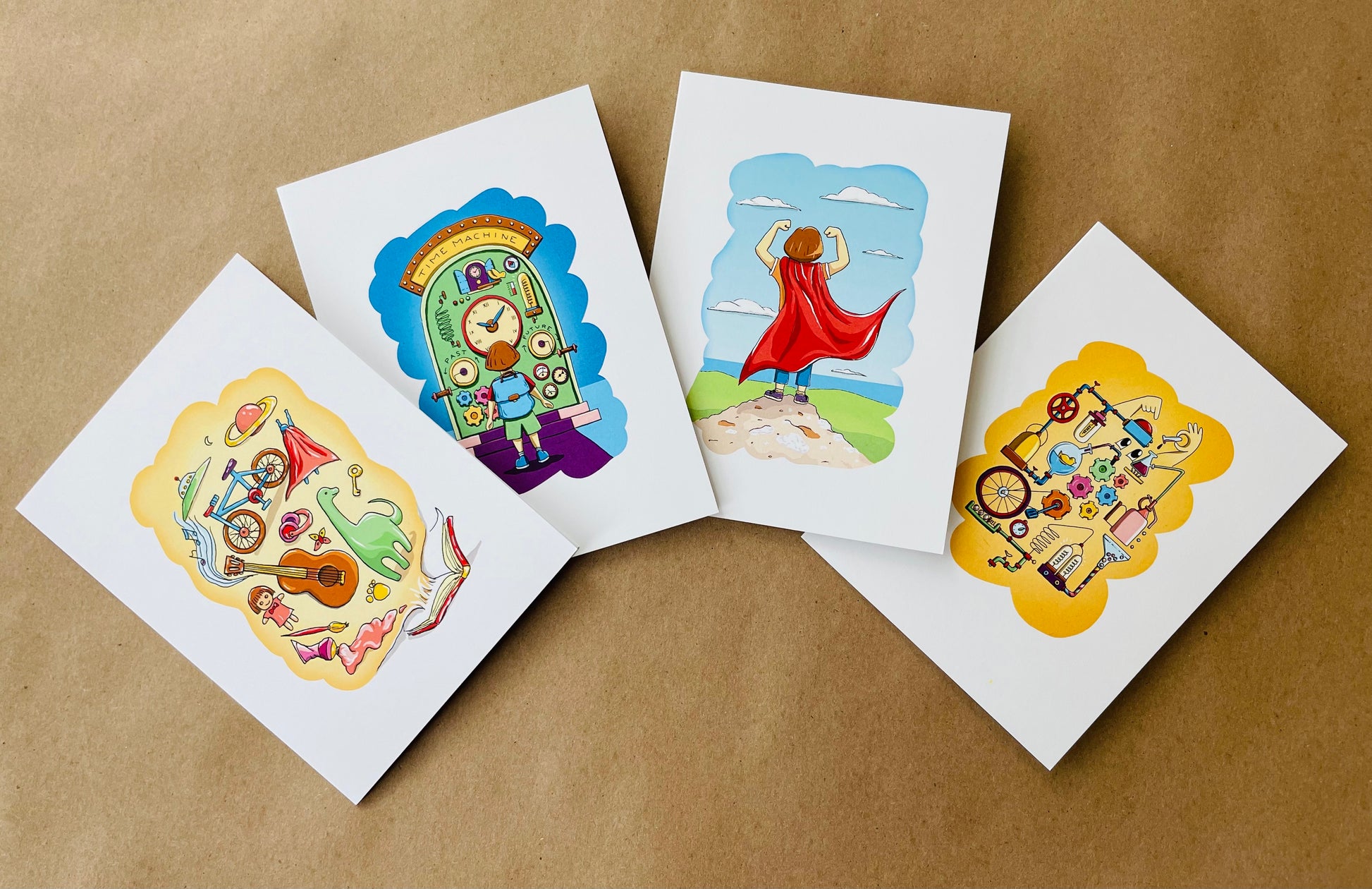 This set of cards paired with prompts is designed to help spark someone's imagination: use them to connect with your kids, to connect your kids with their cousins or their grandparents. The art was designed by a sister illustrator duo and every illustration evokes the prompt.