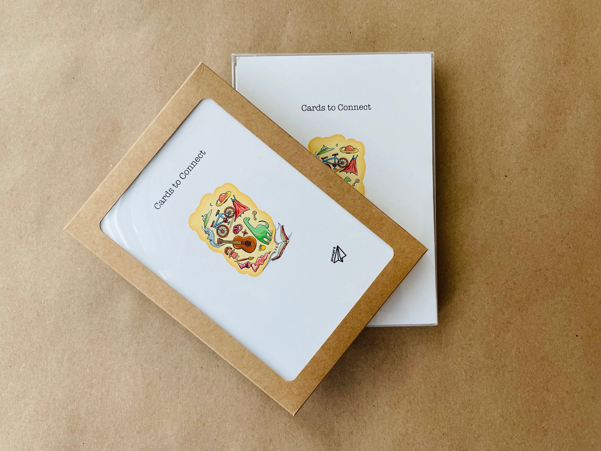 The package contains two sets of four cards (each card has a prompt). Keep one set and give the other one to someone you wish to connect with OR ship the second set directly to someone else (click 'Add Gift Options' at check-out to enter their address and a note).