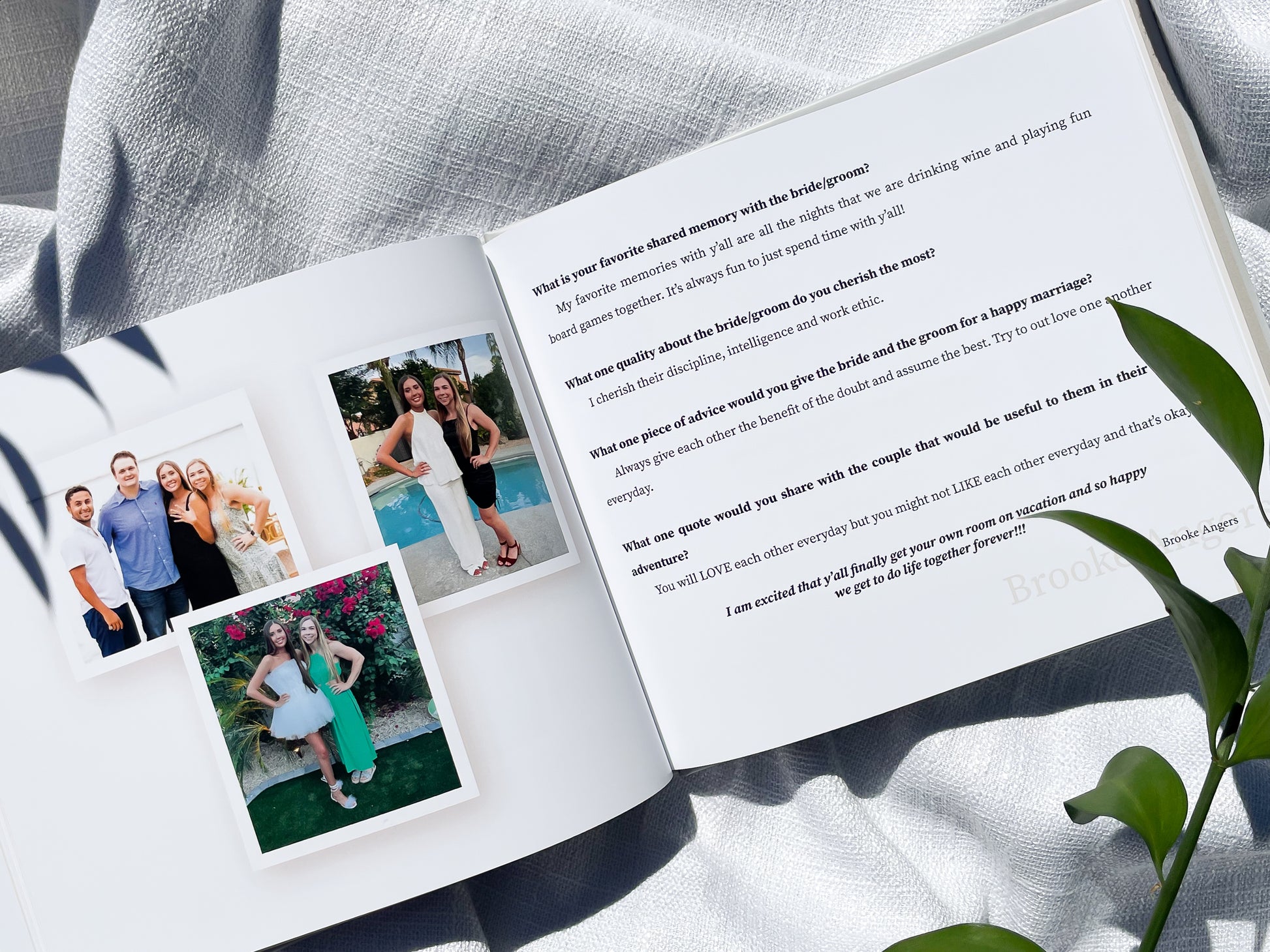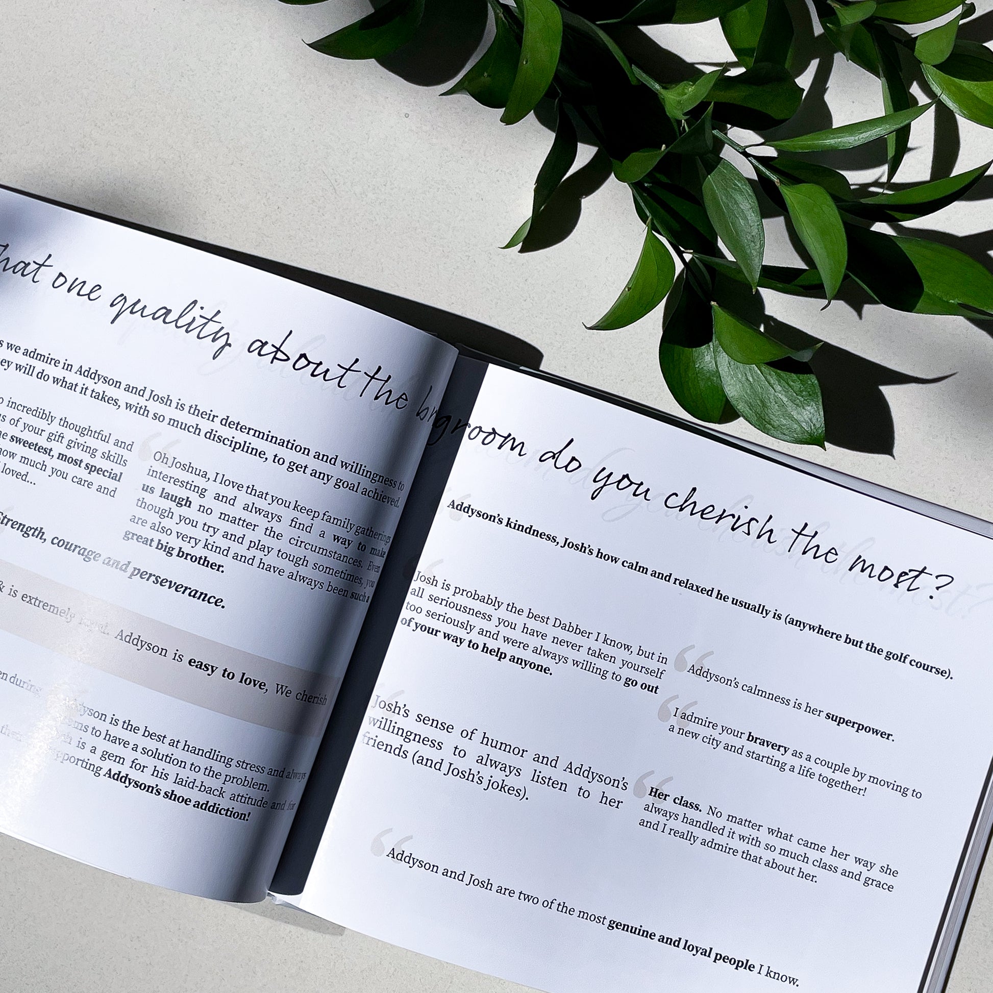 Letters to the Couple is a collaborative book created by all the wedding guests before the wedding day, in the comfort of their homes, with plenty of time and guidance to say something meaningful. We prompt everyone to answer certain questions about the couple (including providing photos) and combine their answers and stories in a book that is made just for the couple.